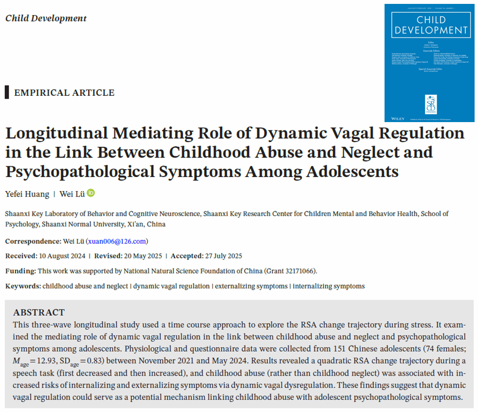 Huang, Y., & Lü, W.* (2025). Longitudinal mediating role of dynamic vagal regulation in the link between childhood abuse and neglect and psychopathological symptoms among adolescents. Child Development, 96, 2133–2145. https://doi.org/10.1111/cdev.70027