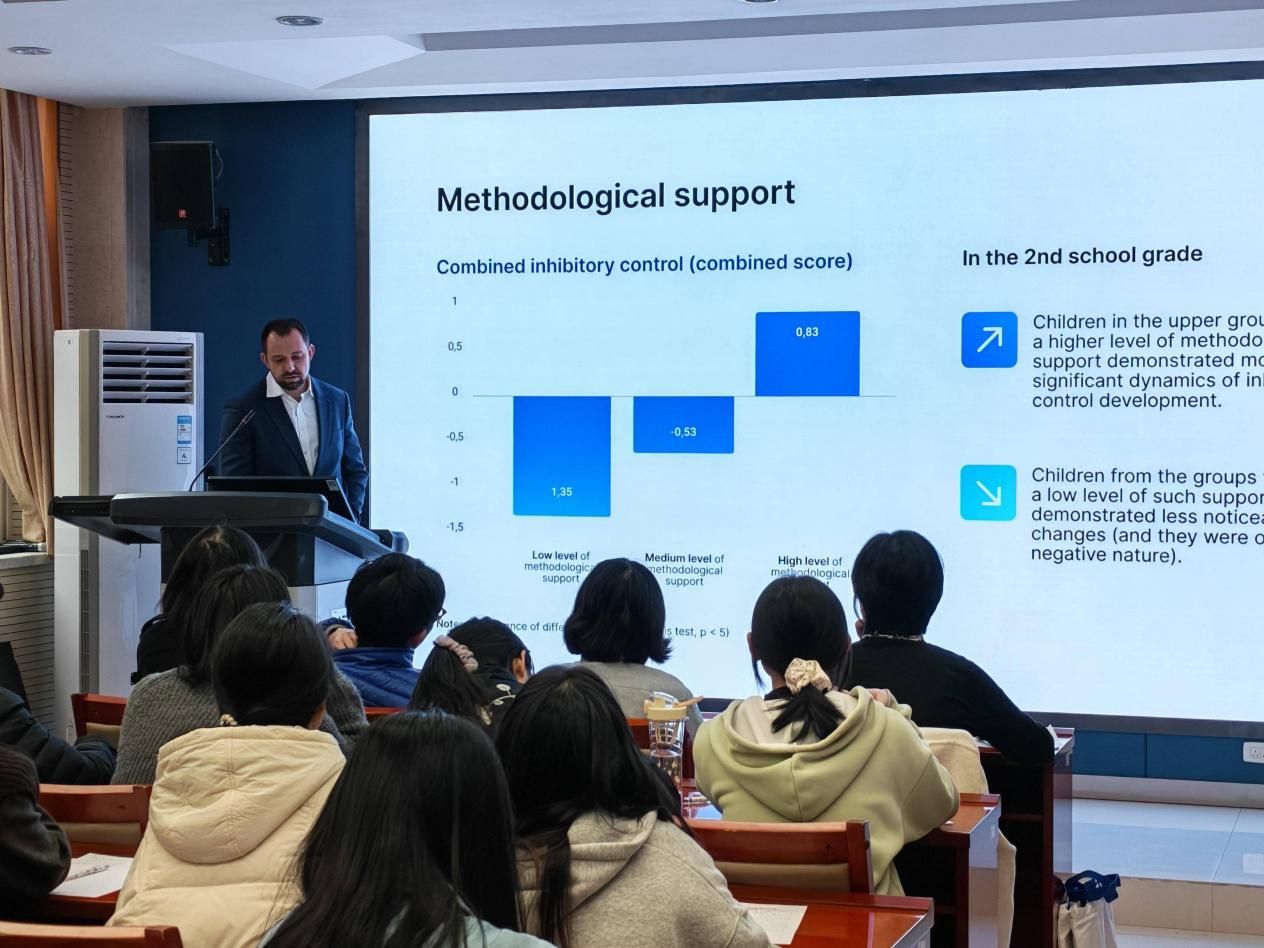 首场讲座由亚历山大·维拉克斯院士主讲,题为《文化历史观视角下的当代儿童现象学》。作为儿童心理学与早期教育领域的权威专家,他以维果茨基文化历史理论为基础,聚焦数字化时代中儿童心理发展的新现象,结合自身丰富的跨文化研究经验,系统阐述了影响儿童认知发展与社会情感能力的关键因素,并分享了将理论成果转化为教育实践的成功案例。维拉克斯院士曾于2020年荣获俄罗斯联邦总统青年科学家奖,其研究成果在儿童心理学领域具有广泛影响力。