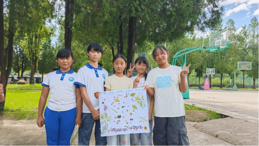 实践队成员王健带领孩子们走进自然,开展植物拓印创作。孩子们在校园中收集落叶与花瓣,仔细排列于棉布之上,再用石头轻轻敲击,创造出独一无二的拓印作品。这堂融合自然教育、艺术体验的课程,深受孩子们喜爱。